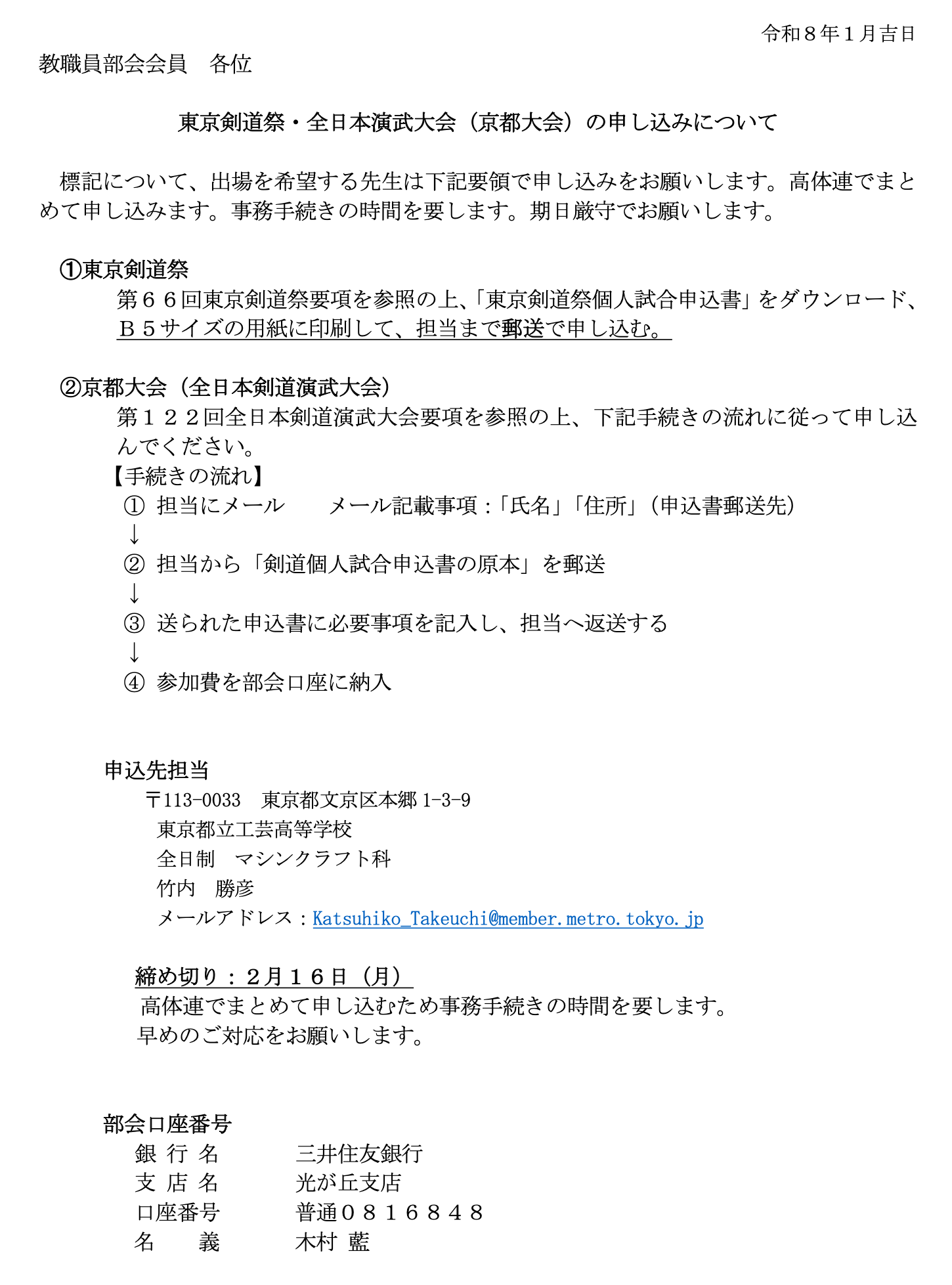 2026年1月16日 / 最終更新日 : 2026年1月16日 webm 教職員部会 [教職員部会より]東京剣道祭及び全日本剣道演武大会に関するお知らせ 関係書類 PDFダウンロード 東京剣道祭及び全日本剣道演武大会に関するお知らせ [案内] 東京剣道祭 要項 / 東京剣道祭 申込書(Excel) 全日本剣道演武大会 要項