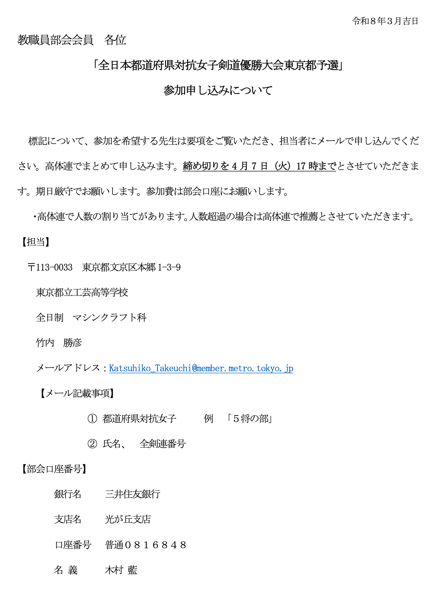 4. 【教職員部会より】全日本都道府県対抗女子剣道優勝大会東京都予選会開催についてのお知らせ